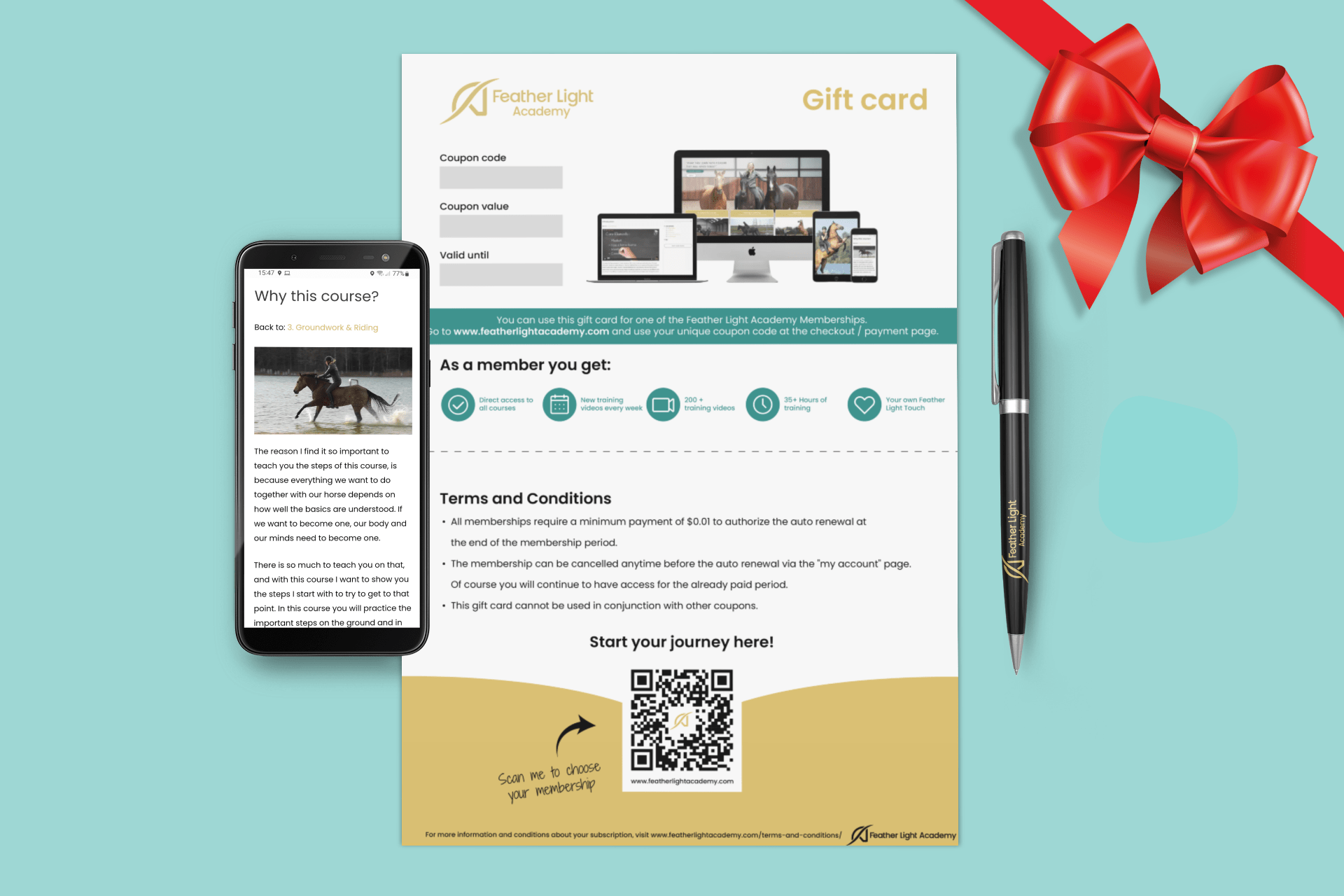 Choose the value of the gift card you want to give. After the purchase you will receive an email with the Gift Card and the corresponding value in PFD format. The Gift Card will include a unique coupon code, this coupon code can be used to purchase any Feather Light Academy membership (for example: monthly, quarterly or yearly).